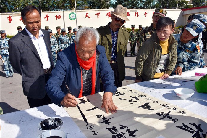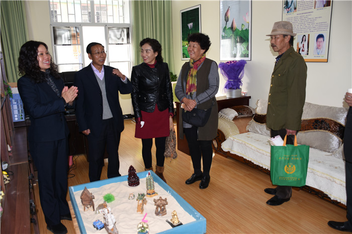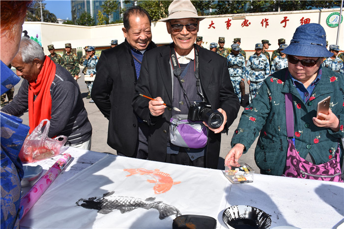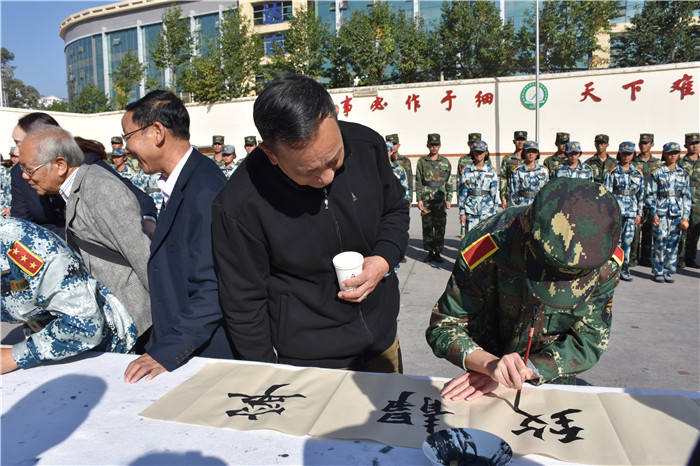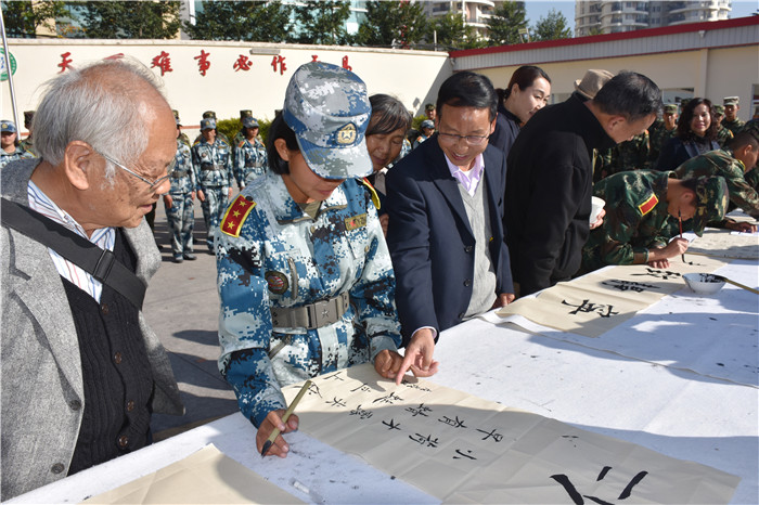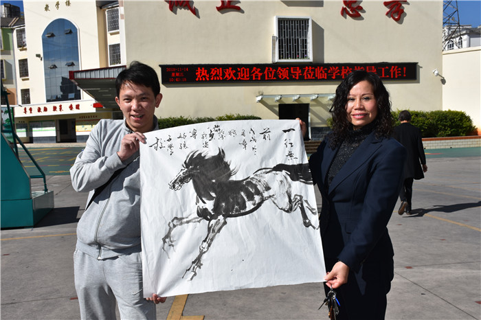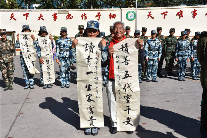 老領(lǐng)導(dǎo)們在指導(dǎo)孩子們書法的同時,還不時走到孩子們中間去,噓寒問暖。當和學(xué)?蓯鄣摹靶〔稽c”聊天時,孩子的堅韌懂事,讓領(lǐng)導(dǎo)們很是欣慰。