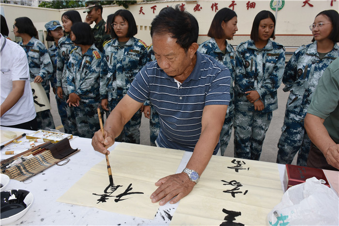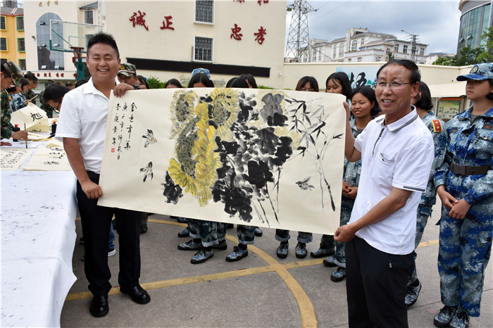 聯(lián)誼匯演結(jié)束,聽說老領(lǐng)導(dǎo)們都身懷絕技,在繪畫、書法上都頗有造詣,孩子們豈能錯過這樣的好機(jī)會,迫不及待地與老師一起把筆墨紙硯準(zhǔn)備好,列隊等著觀摩學(xué)習(xí)。李主任、“五老”鄧成列、徐繼泉等領(lǐng)導(dǎo)不辭辛勞,現(xiàn)場毫不吝嗇地?fù)]毫潑墨,只見筆墨飛舞間,一幅幅遒勁有力、氣勢非凡的的書法作品和活靈活現(xiàn)的《向日葵》水墨畫躍然紙上,呈現(xiàn)在大家眼前,令人賞心悅目,師生們贊不絕口,力量倍增。