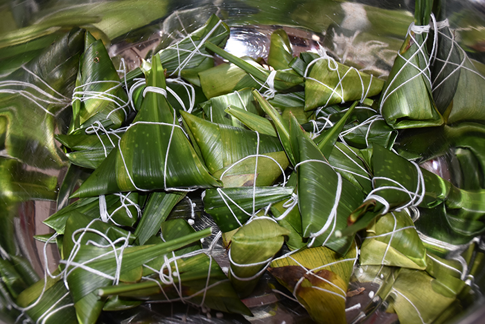 早點(diǎn)過(guò)后,師生們準(zhǔn)備好了所有材料,同學(xué)們?cè)诶蠋煹闹笇?dǎo)下,清洗粽葉,準(zhǔn)備包粽子。不一會(huì)兒,所有材料準(zhǔn)備就緒,大家就開(kāi)始包起粽子。細(xì)長(zhǎng)的粽葉在師生們靈活的手指下團(tuán)成漏斗狀,糯米合著花生、火腿被包進(jìn)粽葉中,一根根細(xì)彩線纏繞在粽子上。折粽葉、填糯米、裹葉子、系線,一時(shí)間粽葉飛舞,絲線穿梭,一個(gè)個(gè)玲瓏而秀氣的粽子不一會(huì)兒便誕生了,在這過(guò)程中,大家還交換了如何把粽子包的更漂亮、更有型的心得。大家一邊包粽子,一邊分享著端午這一傳統(tǒng)節(jié)日的故事;顒(dòng)現(xiàn)場(chǎng)一片歡騰,笑聲連連,整個(gè)餐廳沉浸在一片歡樂(lè)的海洋里。