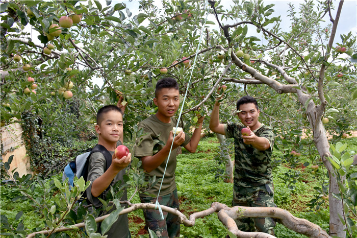 依依不舍地下山,我們來到了綠色而生態(tài)的有機蘋果基地,聽聞此基地的蘋果知名度很高,都是來自昭通大山里的優(yōu)質(zhì)品種,聽到這里,孩子們早已唇齒生津,正是烈日當空,清甜脆爽的蘋果無疑是消暑佳品!跋氤蕴O果就要自己動手喲!”一聲號令,孩子們已經(jīng)紛紛鉆進蘋果林中,各顯其能,大快朵頤起來。品嘗著親自勞動得來的碩果,孩子們滿足地吃著鬧著,這一刻,他們似乎品嘗到的是辛勤勞動的快樂,較之蘋果本身的美味,這份滋味更值得孩子們在人生的每一階段細細品味。
