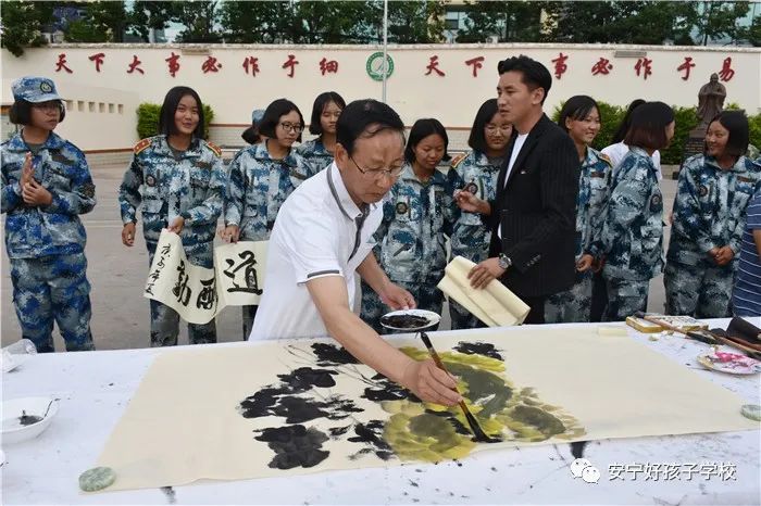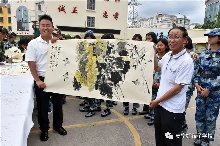 聯(lián)誼匯演結束,聽說老領導們都身懷絕技,在繪畫、書法上都頗有造詣,孩子們豈能錯過這樣的好機會,迫不及待地與老師一起把筆墨紙硯準備好,列隊等著觀摩學習。李主任、“五老”鄧成列、徐繼泉等領導不辭辛勞,現(xiàn)場毫不吝嗇地揮毫潑墨,只見筆墨飛舞間,一幅幅遒勁有力、氣勢非凡的的書法作品和活靈活現(xiàn)的《向日葵》水墨畫躍然紙上,呈現(xiàn)在大家眼前,令人賞心悅目,師生們贊不絕口,力量倍增。