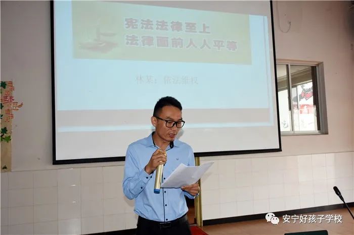 隨后,法制講座在寧湖律師事務所李濤律師的主講中拉開序幕。李律師以青少年在校期間應知應會的基本法律常識為重點,從“你身邊所熟知的法律”講起,結(jié)合學生的生理、心理、年齡段特點容易誘發(fā)的違法犯罪問題,以真實、鮮活的典型案例進行剖析,舉案說法,警醒同學們應時刻遵守法律,敬畏法律,珍惜自由,珍愛生命,做一個對自己負責、對社會負責的遵紀守法的好公民。