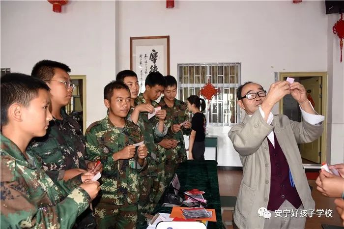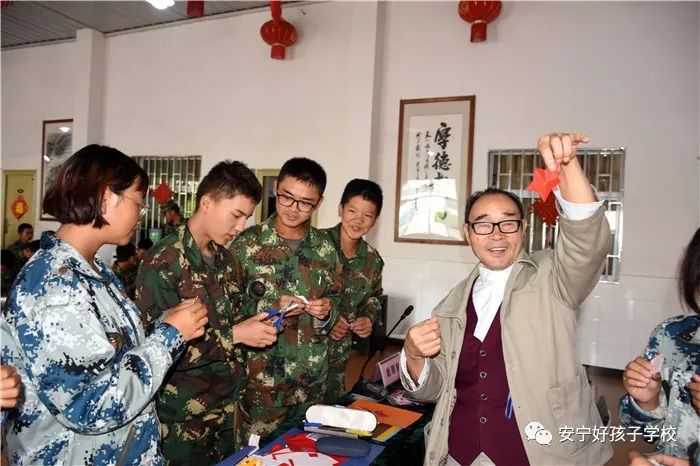 結(jié)合活動主題,耿老從簡單的剪“紅五星”及“法”字著手,再增加難度到“!、“囍”、“蜻蜓”等圖案,不厭其煩地講解折紙、裁剪角度等要領。同學們上下翻折著手中的彩紙,時而低頭思索,時而拿起來認真對照圖樣,神情十分專注。在耿老的精心指導下,同學們一折、一剪、一展,剪紙仿佛有魔法一般,一個個栩栩如生的作品便躍然眼前,在場的人無不發(fā)出聲聲驚嘆。耿老還現(xiàn)場把孩子們裁剪的作品塑封好,分發(fā)給他們。孩子們拿著自己的“杰作”,紛紛拍照留念,舉在頭頂?shù)摹胺ā弊,也成了此次活動的點睛之筆。