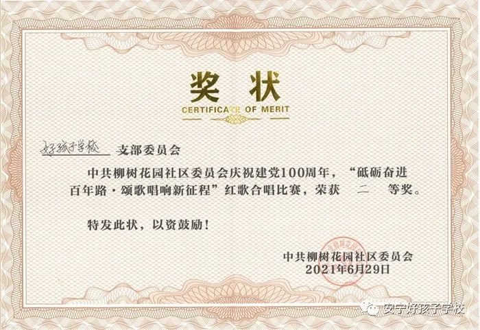 為隆重慶祝中國(guó)共產(chǎn)黨百年華誕,2021年6月29日上午,我校參加由中共柳樹花園社區(qū)委員會(huì)、居民委員會(huì)主辦的慶祝建黨100周年系列活動(dòng)之“砥礪奮進(jìn)百年路 頌歌唱響新征程”合唱比賽活動(dòng),以一首《唱支山歌給黨聽(tīng)》喜獲二等獎(jiǎng)。