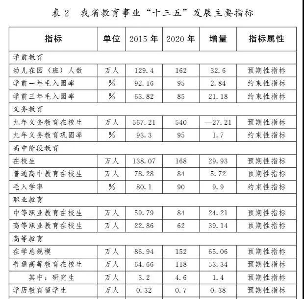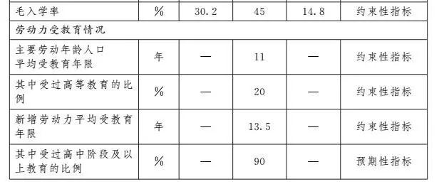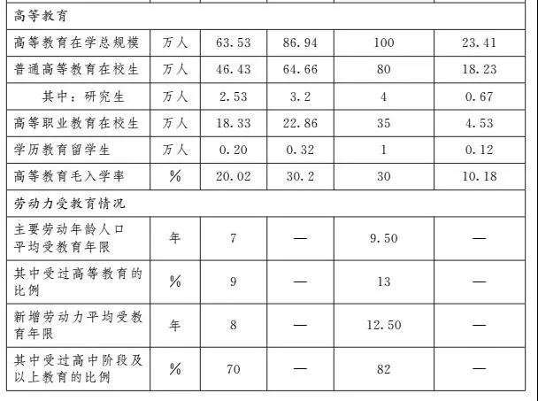 到2020年,基本普及學前教育,學前一年毛入園率達95%,學前三年毛入園率達85%以上;完成義務教育均衡發(fā)展目標,129個縣、市、區(qū)全部實現(xiàn)縣域內(nèi)義務教育基本均衡發(fā)展,九年義務教育鞏固率達95%;普及高中階段教育,高中階段教育毛入學率達90%以上,普通高中和中等職業(yè)教育協(xié)調發(fā)展;基本建成中等、高等職業(yè)教育相互銜接貫通的現(xiàn)代職業(yè)教育體系,中等職業(yè)學校和普通高中招生規(guī)模大體相當;擴大高等教育規(guī)模,高等教育毛入學率達45%以上;暢通繼續(xù)教育、終身學習通道,基本建成靈活開放的終身教育體系。主要勞動年齡人口平均受教育年限達到11年,其中受過高等教育的比例達20%,新增勞動力平均受教育年限達到13.5年,其中受過高中階段及以上教育的比例達90%左右。