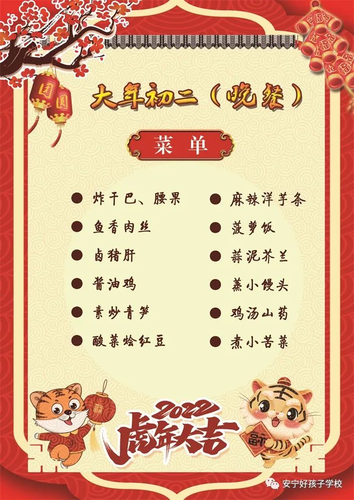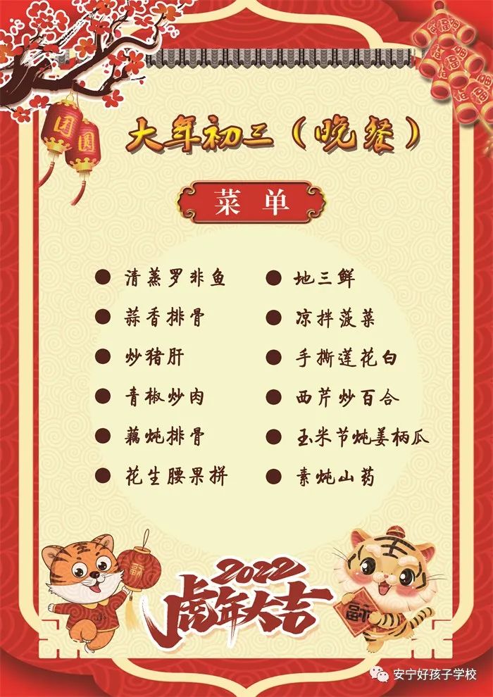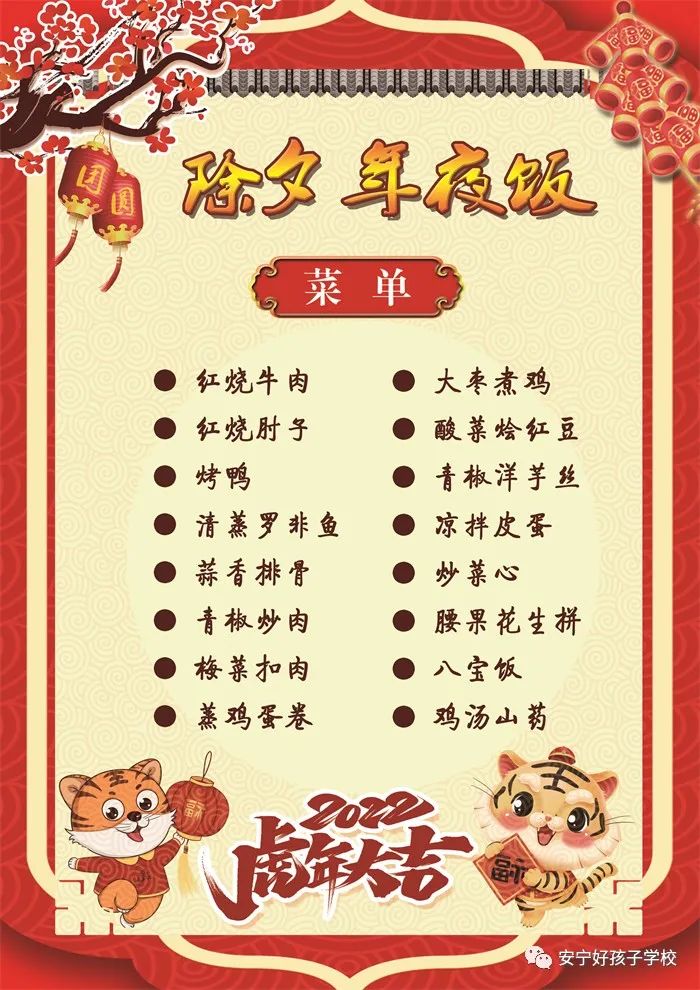 過年了 !孩子們吃什么?這是學校領導幾天來一直思考的問題。經(jīng)過與學校營養(yǎng)師、食堂廚師們多次商議后,本著營養(yǎng)、健康、不浪費,又要保證孩子每餐都能吃上新鮮可口的飯菜,終于議定了菜單,現(xiàn)予以公布。祝孩子們新年快樂!祝全體家長萬事如意!