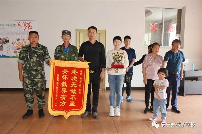 近日,我校學(xué)生段皓然、連瑞、祁云豪相繼畢業(yè)。在畢業(yè)典禮上,三位同學(xué)的家長分別將繡有“疼愛無微不至 關(guān)懷教導(dǎo)有方”、“拯救心靈的圣地 孕育新生的搖籃”、“良師幫我脫胎 教官助我換骨”和“春蠶織出滿園錦繡 燭炬照紅一代心靈”字樣的錦旗贈(zèng)給學(xué)校,以此感謝學(xué)校和老師對(duì)孩子的諄諄教誨和無微不至的關(guān)懷,四面錦旗飽含著家長誠摯的謝意,也蘊(yùn)藏著老師們愛的情懷。