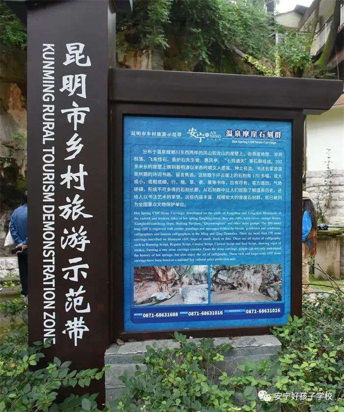 不知不覺間來到了溫泉小鎮(zhèn)摩崖石刻群,上面匯集著從明代至民國年間云南和全國詩書畫名師大家游覽溫泉留下的題詞、詩歌、碑銘、壁畫和書法集錦。古韻十足的摩崖石刻,引得同學們駐足觀看,在驚嘆大自然鬼斧神工的同時,也不忘仔細揣摩石崖上鐫刻著的詩詞書畫,觀之既能讓人了解溫泉歷史,又給人以藝術美的享受。