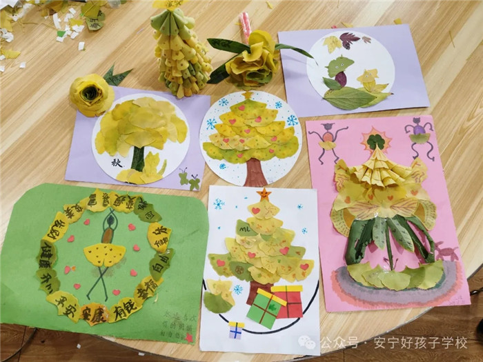 有的同學把銀杏葉剪裁、拼接,制作成了一幅幅充滿詩意的樹葉畫;有的把銀杏葉組合成了美麗的花朵,色彩斑斕,仿佛散發(fā)著沁人的芬芳;有的將銀杏葉拼成了栩栩如生的動物形象,如靈動的蝴蝶、可愛的兔子、歡快的魚兒;還有的則拼成婀娜的舞者、優(yōu)雅的公主裙、漂亮的圣誕樹......每一件作品都凝聚著孩子們的創(chuàng)意和用心,展現(xiàn)了他們對自然之美的獨特理解。
