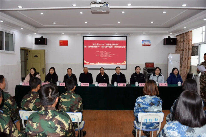 為深化校園法治安全教育,引導(dǎo)未成年人養(yǎng)成遵紀(jì)守法的行為習(xí)慣,提高未成年人法治意識(shí),預(yù)防和減少未成年人違法犯罪,創(chuàng)建健康安全的校園環(huán)境。2024年11月28日,由共青團(tuán)安寧市委、市關(guān)工委、市未司辦、云南省未成年犯管教所主辦,安寧市向日葵青少年事務(wù)服務(wù)中心與我校承辦的安寧市2024年“青護(hù)航·法相伴”暨“抵制校園暴力,法護(hù)青年成長”法治宣傳活動(dòng)在我校舉行。安寧市關(guān)工委常務(wù)副主任李庭貴,安寧市關(guān)工委“五老”代表鄧成列、楊云生,云南省未成年犯管教所警官林子毓等領(lǐng)導(dǎo)出席了本次活動(dòng)。