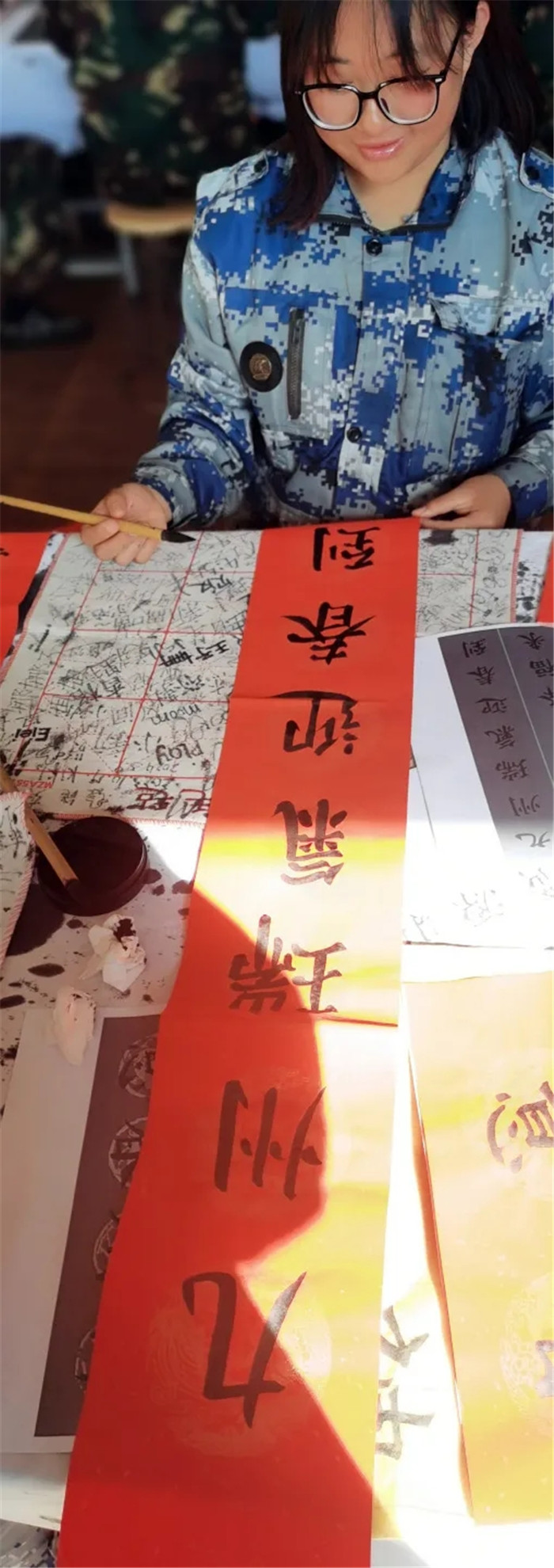 春聯(lián)紙上,孩子們筆走龍蛇。有的筆法雖顯稚嫩,卻充滿童趣;有的運筆嫻熟,字體剛勁有力。春聯(lián)內(nèi)容豐富多樣,有贊頌祖國繁榮昌盛的豪邁之語,有抒發(fā)家庭幸福美滿的溫馨之言,還有祈求學業(yè)進步的懇切之詞。不一會兒,一副副對仗工整、寓意吉祥的精妙詞句便在同學們的筆下應運而生,傳遞出的皆是對新年的美好祝愿。老師寫的福字更是獨具特色,雄渾大氣,無不飽含著對幸福生活的美好向往,F(xiàn)場,紅彤彤的紙張映照著孩子們燦爛的笑顏,新春的喜悅氣息如春風般撲面而來。