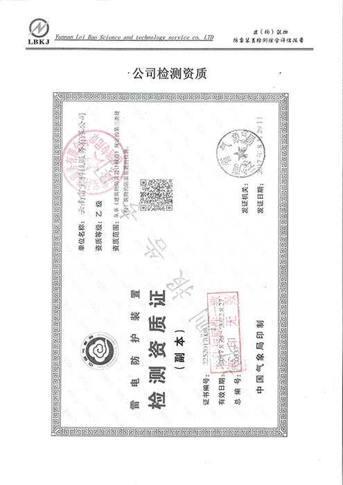 2019年6月26日,為有效預(yù)防和遏制雷電災(zāi)害事故的發(fā)生,我校特委托云南雷寶科技服務(wù)有限公司對(duì)我校的辦公樓、教學(xué)樓、食堂等各建(構(gòu))筑物、供配電系統(tǒng)、設(shè)備設(shè)施及各裝置安裝的防雷設(shè)施進(jìn)行全面檢測(cè),以及對(duì)“防直擊雷裝置”、“防閃電感應(yīng)裝置”、“電涌保護(hù)”、“等電位連接”等防雷裝置進(jìn)行安全評(píng)估,共對(duì)24個(gè)防雷測(cè)試點(diǎn)進(jìn)行了接地性能參數(shù)檢測(cè)。經(jīng)檢查,各項(xiàng)指標(biāo)均符合國(guó)家現(xiàn)行防雷規(guī)范的要求與指標(biāo),并向我校出具了書面檢測(cè)報(bào)告。